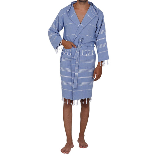 Loom Legacy Traditional Hooded Turkish Bathrobe - 100% Cotton Peshtemal - Blue XS/S